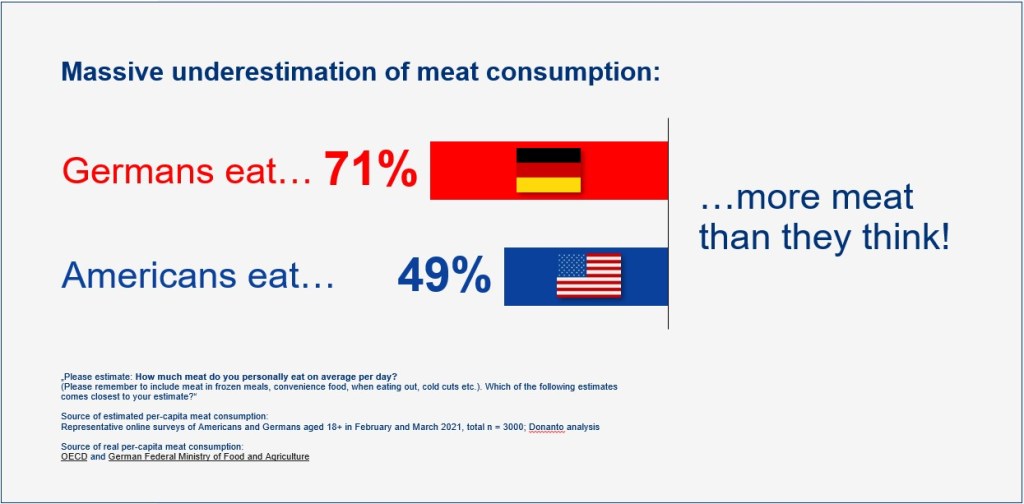 One facet of our climate conundrum is that we sometimes just deny reality. My corresponding example comes served with a generous helping of irony – meat consumption. My surveys with more than 3,000 respondents indicate that both Americans and Germans dramatically underestimate how much meat we actually eat, but there is still a difference: Germans eat 77% more meat than they think, while Americans eat close to 50% more. In Europe, this underestimation might be a nod to a more measured approach, as if to say, “Yes, we consume, but we consume with restraint.” Across the Atlantic, however, the unspoken truth is that the U.S. may be feasting on burgers with an almost celebratory abandon. This disparity not only provides fodder for humorous banter at dinner parties but also highlights a deeper cultural divergence: while Europeans might engage in polite self-deprecation about portion sizes, Americans often have a robust, unapologetic appetite that spills over into their approach to policy and law.