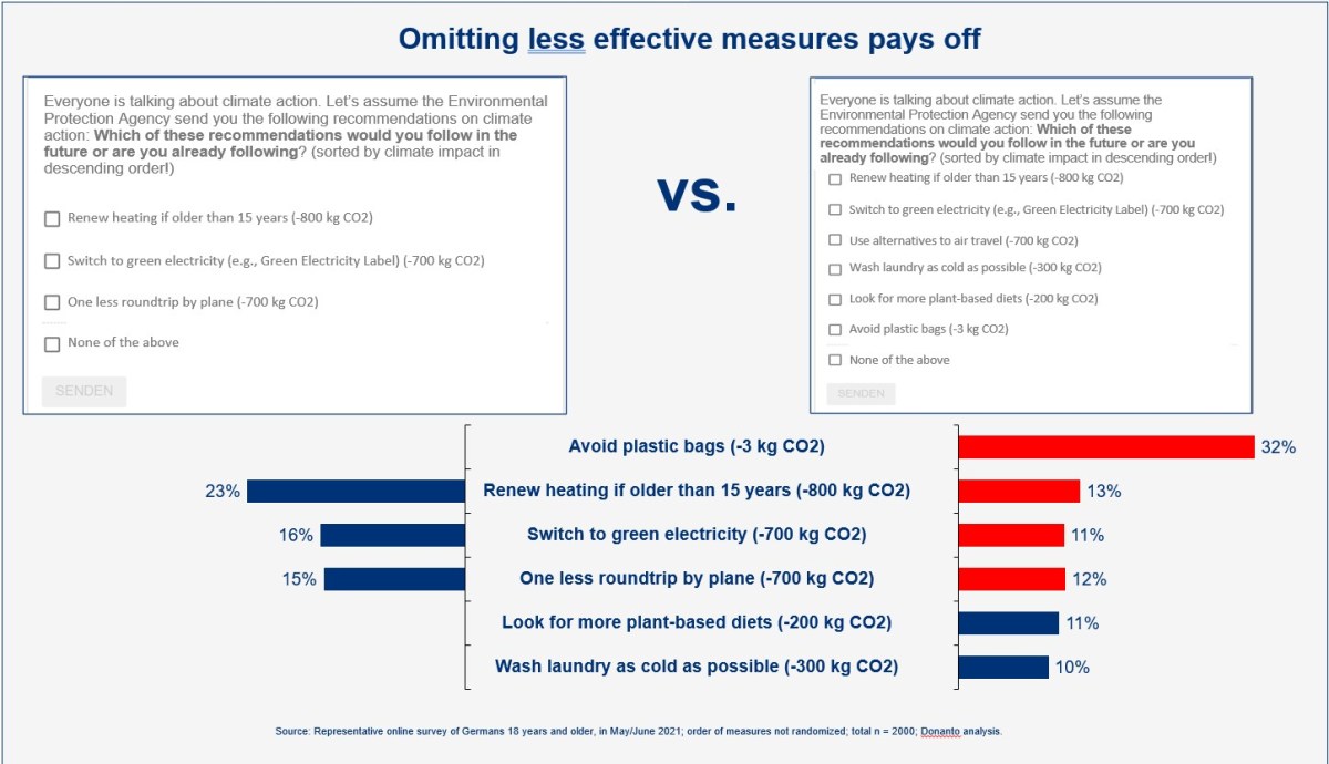 Here is a recent example from my own research: I noticed in a number of surveys with thousands of Americans and Europeans that whenever low-impact measures are presented alongside high-impact ones, the duds tend to dominate attention – regardless of their actual effectiveness. This cognitive trap dilutes focus and weakens outcomes. Therefore, the smart move is to leave the low-impact fluff off the menu entirely – because if it’s on the table, it steals the spotlight.